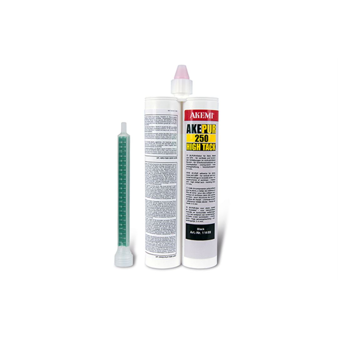 Akepur 250 High Tack is creamy-soft 2-component adhesive based on PUR, fast functional hardness, high bonding strength on metal, ABS, PVC, GRP, natural and artificial stone, low shrinkage, good resistance to solvents, does not foam, not UV-stable, mixing ratio 1:1.