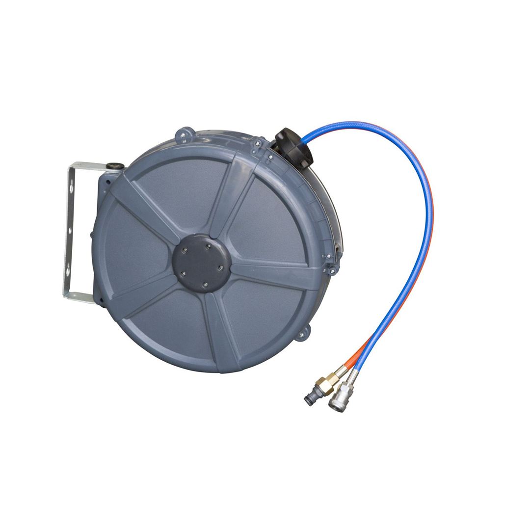 Heavy Duty hose reel with both air line and water line. 8 meters in length plus 1 metre on the rear of the unit to enable connection to existing fittings. Comes with fittings
