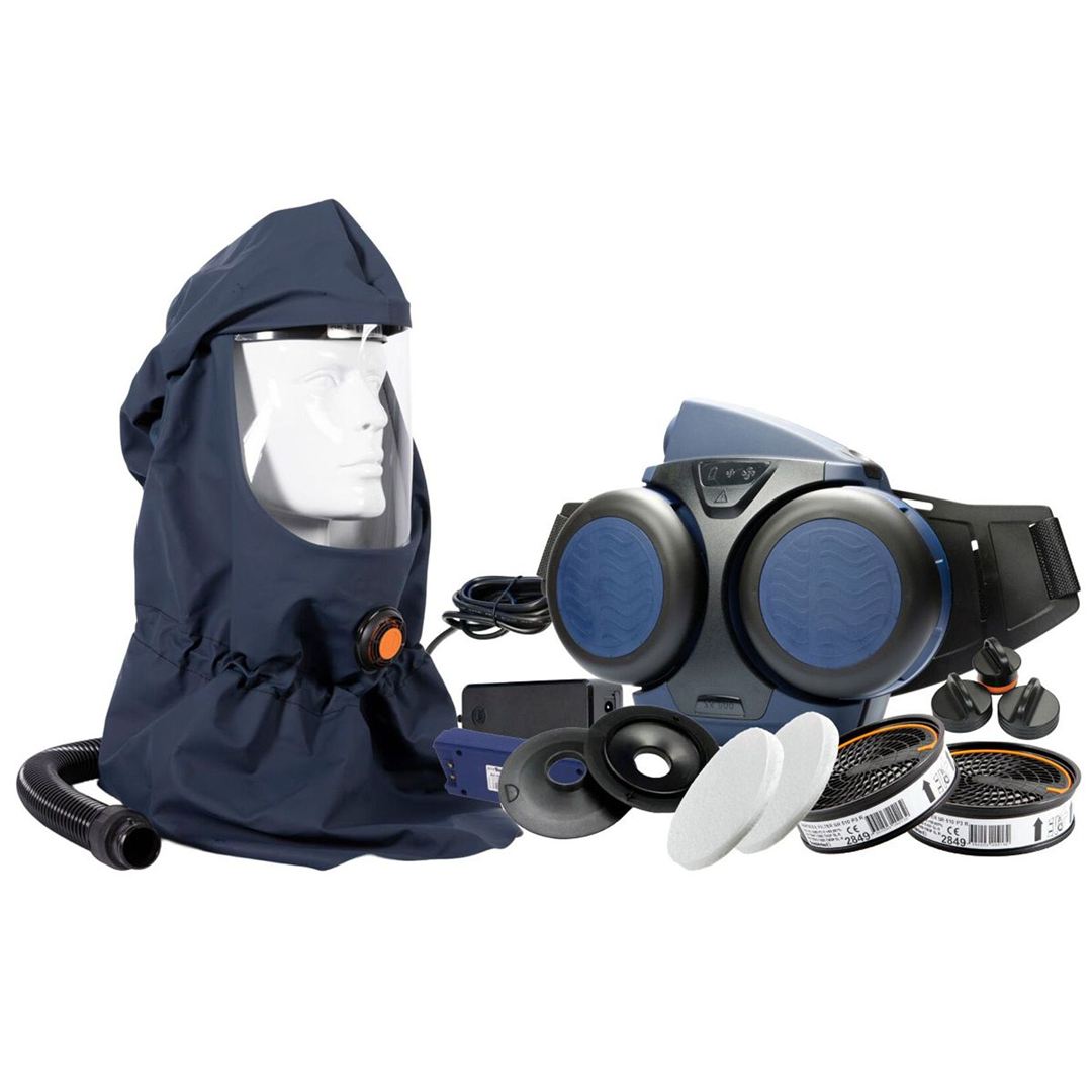 Kit with SR 500 fan unit and hood SR 530. Contains, SR 500 fan unit, SR 530 hood, battery STD, battery charger SR 513, belt SR 508, 2 pcs SR 510 P3 R particle filter, 2 pcs filter adapters, 10 pcs SR 221 pre-filter, 2 pcs pre-filter holder, flow meter, plug kit, cleaning tissue and user manuals.