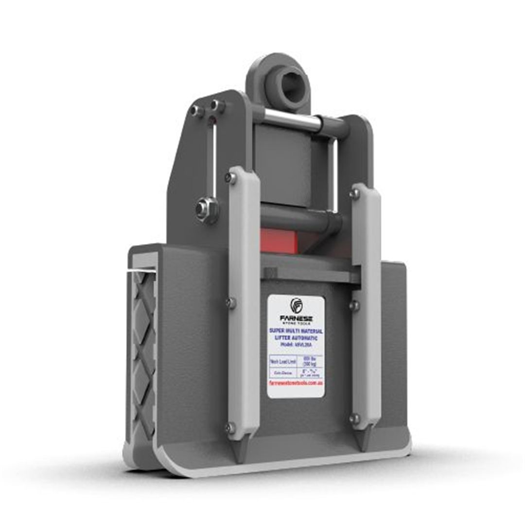 The opening and closing mechanism of the clamp jaws is fully automatic. Each time you lift up and down, the automatic locking latch will lock and release the clamp. White rubber on the clamp jaws not only increase its friction to grip the slab/sheet securely but also protect the slab/sheet surface from damages. This lifter can be used with a crane hoist or forklift boom too clamp, to lift, and to transport slabs/sheets.